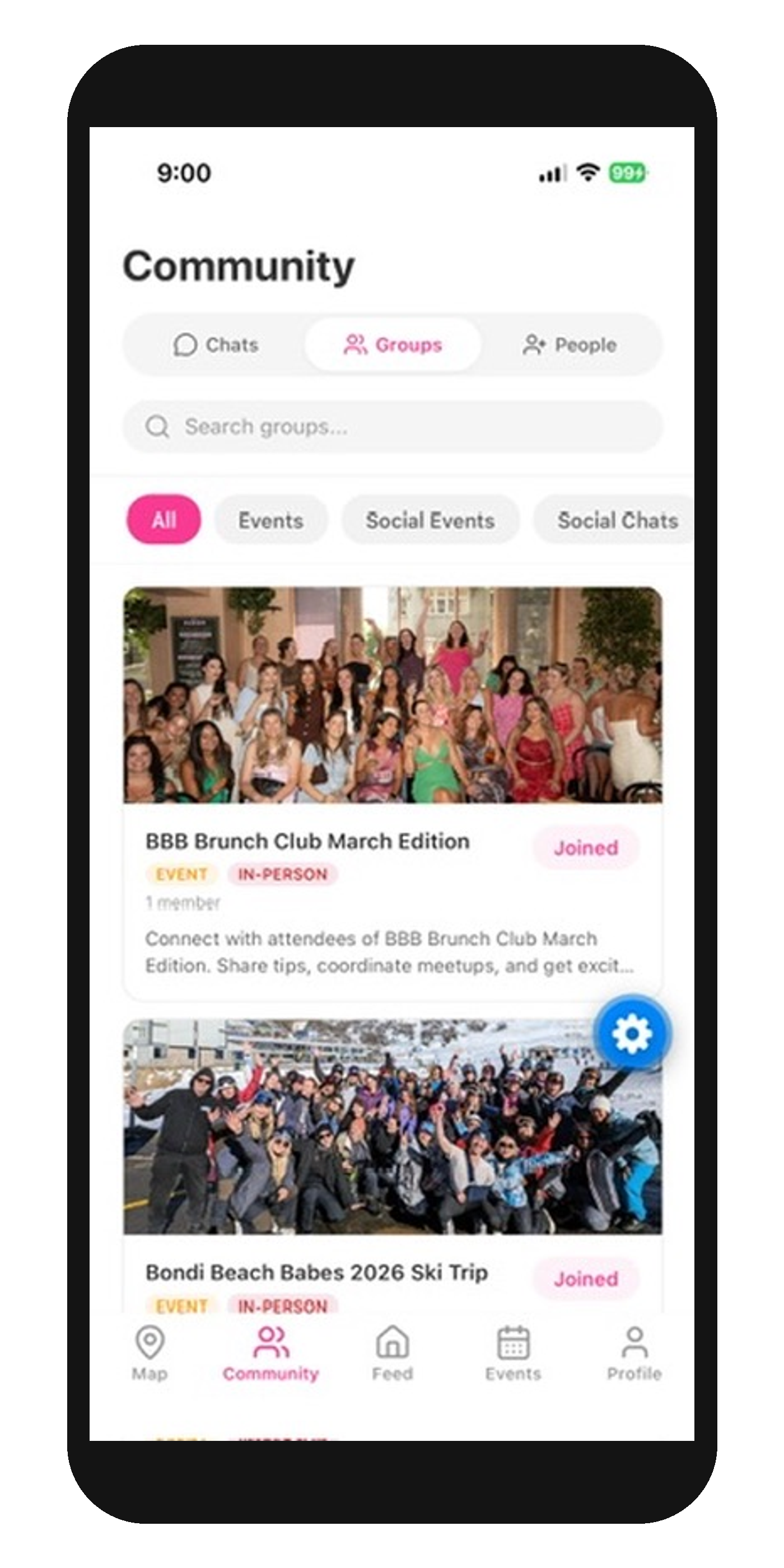 Brunch clubs, ski trips, fitness groups — with built-in chat.